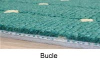 ¿De que forma se disponen las fibras? Bucle : Resistente al uso. Normalmente productos económicos pero muy resistentes al transito intenso de personas, el aspecto es como de orlas o nuditos en forma de U invertida. Generalmente esta forma de presentar la fibra es la más común y apropiada para las moquetas en losetas (moquetas modulares) siendo resistente al transito intenso de personas.