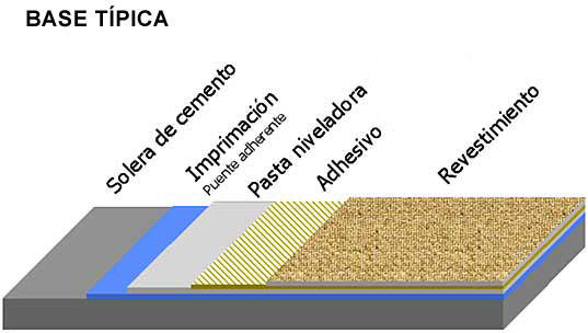 ¿Cual es la base o solera ideal para instalación de moqueta? Para la instalación de la mayoría de pavimentos ligeros entre ellos la moqueta recomendamos una base plana, dura, firme, nivelada, limpia y seca siendo quizá la base ideal la de terrazo desbastado y/o similares con las características descritas anteriormente. En aquellas ocasiones que por algún motivo no contemos una una base como la descrita será necesario la preparación de la misma, para ello se procederá a la aplicación de pastas niveladoras - pastas alisadoras, la función de estas pastas niveladoras es la de formar una superficie plana y dura donde poder aplicar el adhesivo de una forma correcta para la posterior instalación.