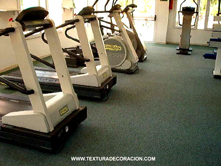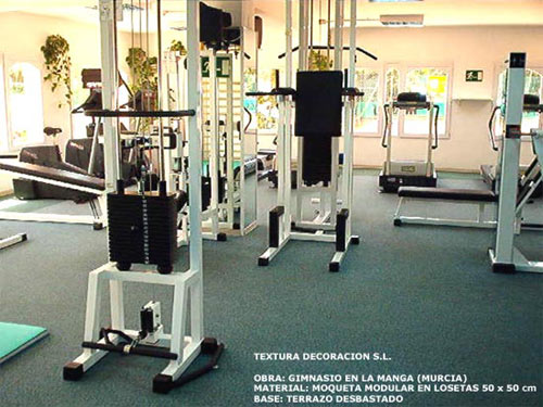 Instalaciones  higiénicas:      Las instalación de moqueta es optima para multitud de entornos, aquí tenemos un claro ejemplo en un Gimnasio donde los usuarios transcurrido algún tiempo siguen disfrutando la calidez y comodidad de la moqueta bajo sus pies mientras que se ponen en forma, un pavimento de moqueta funcionando y aportando confort y elegancia a estas instalaciones.