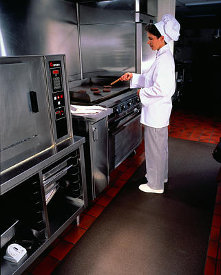 permanece muchas horas de pie, detrás de la barra de restaurantes,